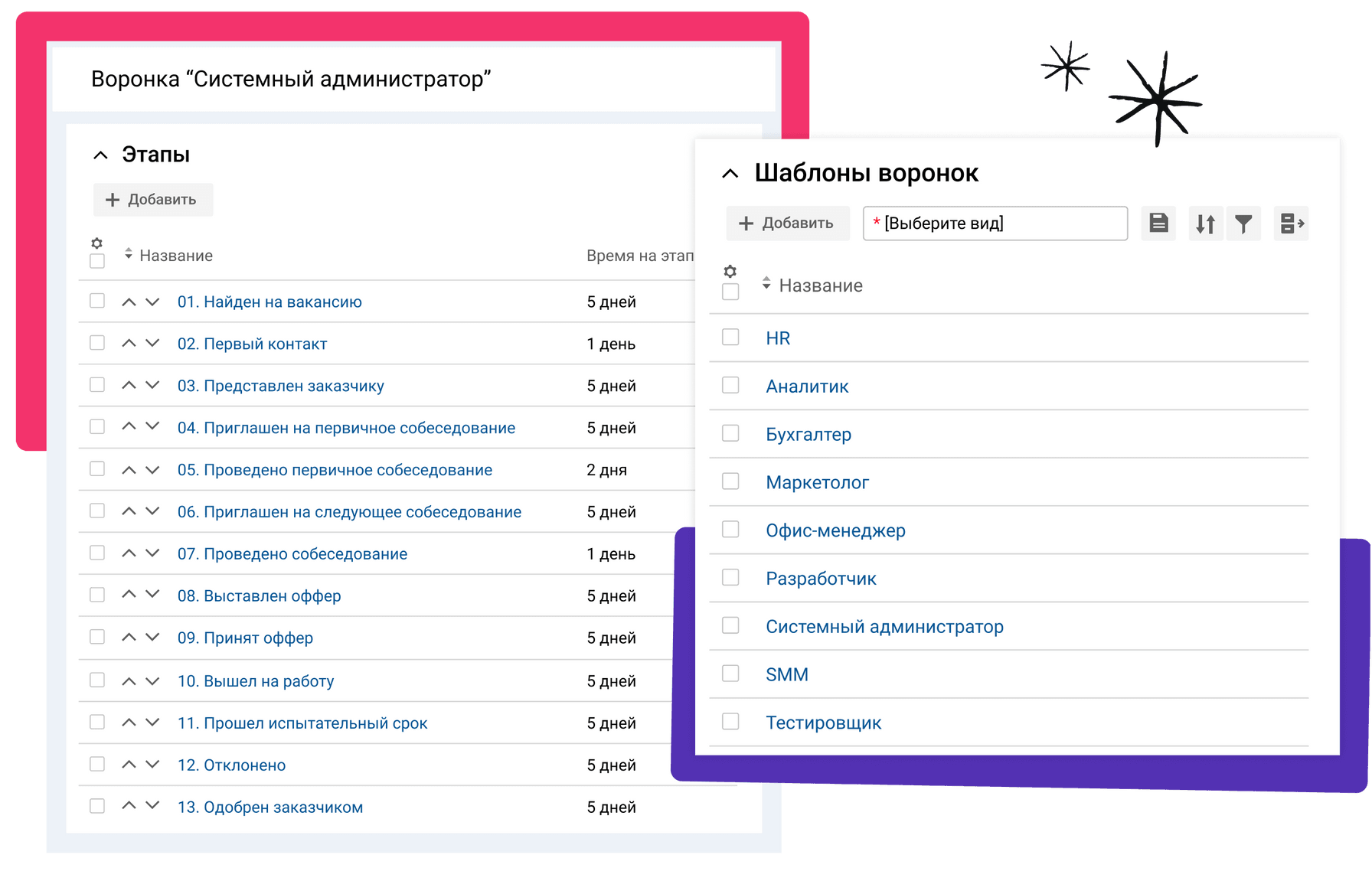 - дает возможность корректировать воронки найма — не придется подстраиваться под ПО, а создание шаблонов воронок ускорит подготовку вакансии;