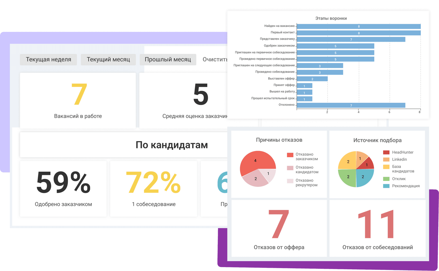 - показывает дашборды по кандидатам и вакансиям — сразу видна продуктивность рекрутеров и проблемные зоны в найме.