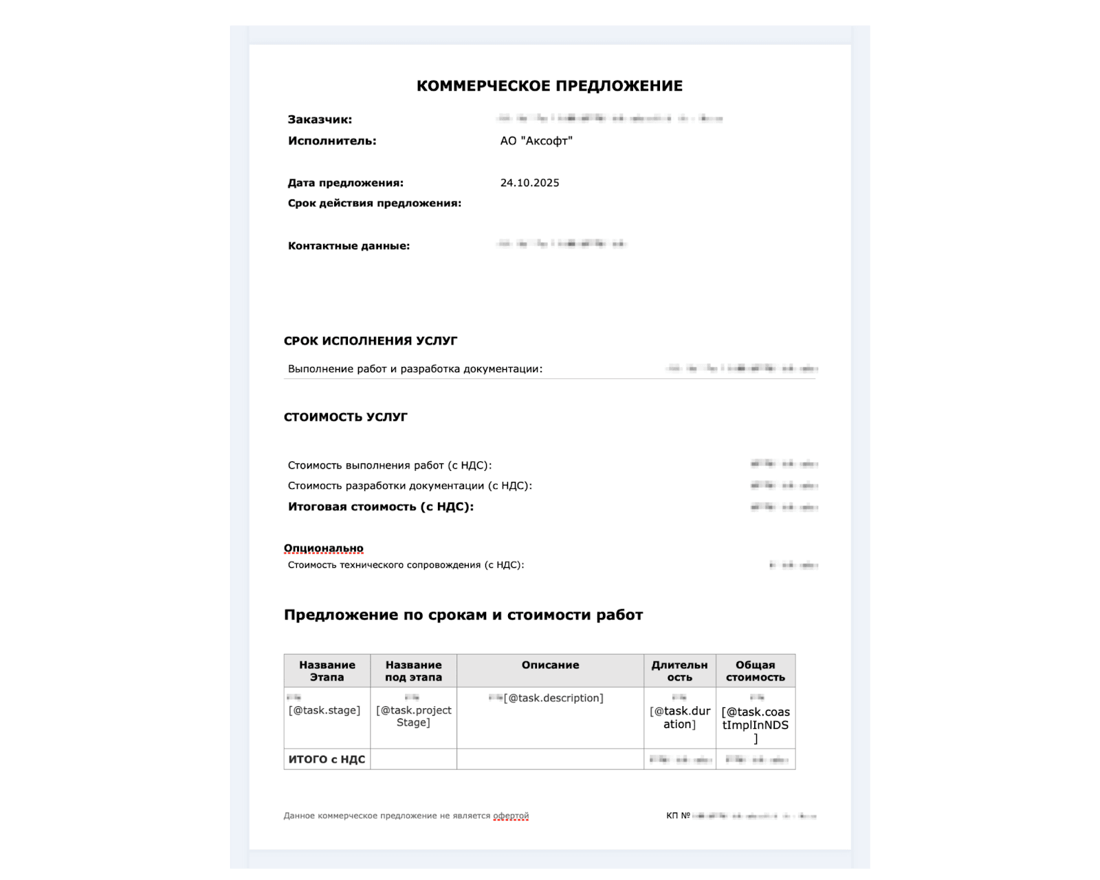 В данный момент ведется работа по автоматизации подготовки ТКП. Процесс реализуют с использованием модуля проектов. Подготовка предложения — это отдельный проект с задачами, сроками и исполнителями. С помощью функциональности печатных форм информация выводится в необходимой структуре с подстановкой нужных переменных.