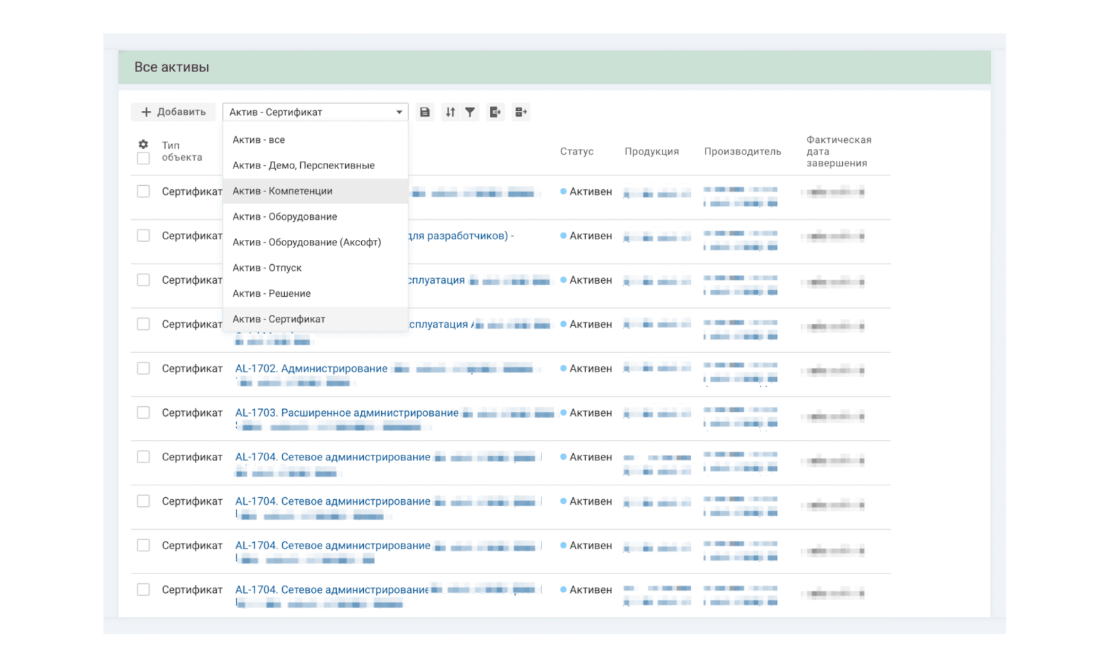 Сертификаты и компетенции. В сервис деск внесли дополнительные классы активов, относящиеся к профессиональным навыкам сотрудников. По каждому исполнителю ведется реестр пройденных обучений, сданных экзаменов, компетенций по определенным продуктам, уровню навыков по направлениям деятельности — пресейл, пилотирование, внедрение. Информация о навыках исполнителя нужна в управлении ресурсами отделов и распределении задач.