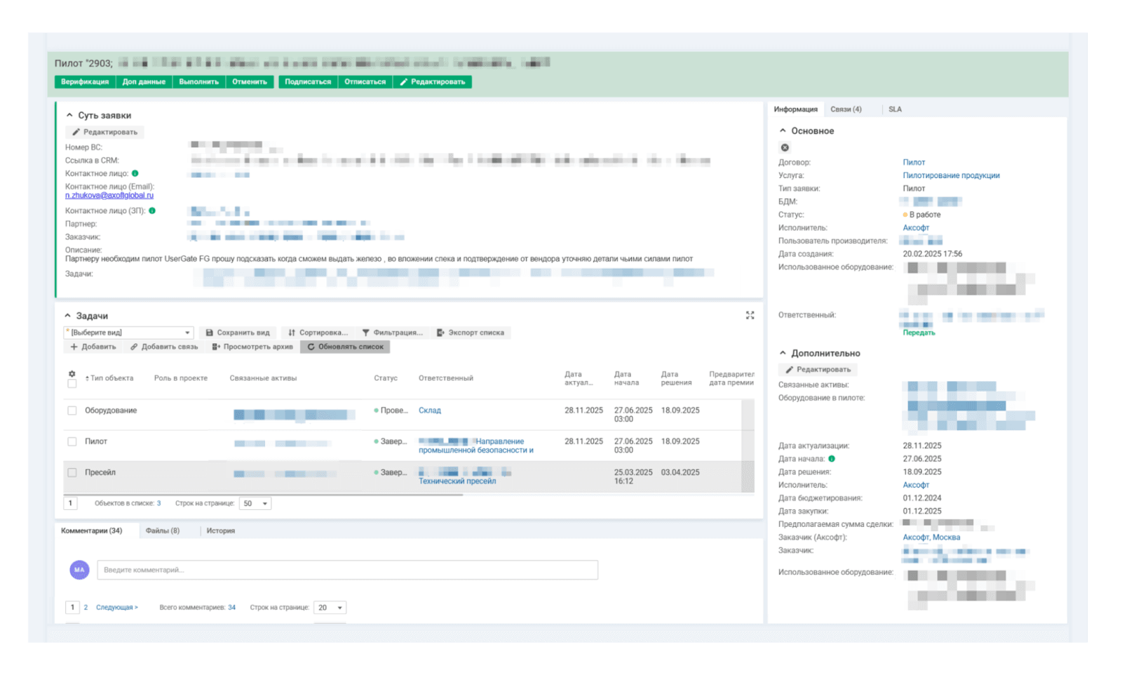 В заявке на пилотирование содержатся задачи для менеджеров по пресейлу и инженеров, а также задача по оборудованию, если развертывание требует дополнительных физических мощностей. В задачах по оборудованию отслеживают отправку активов со склада и возврат на основе приложенных актов и смены статусов. Данные о загрузке оборудования помогают вести учет и принимать решения о закупке, списании или продаже.