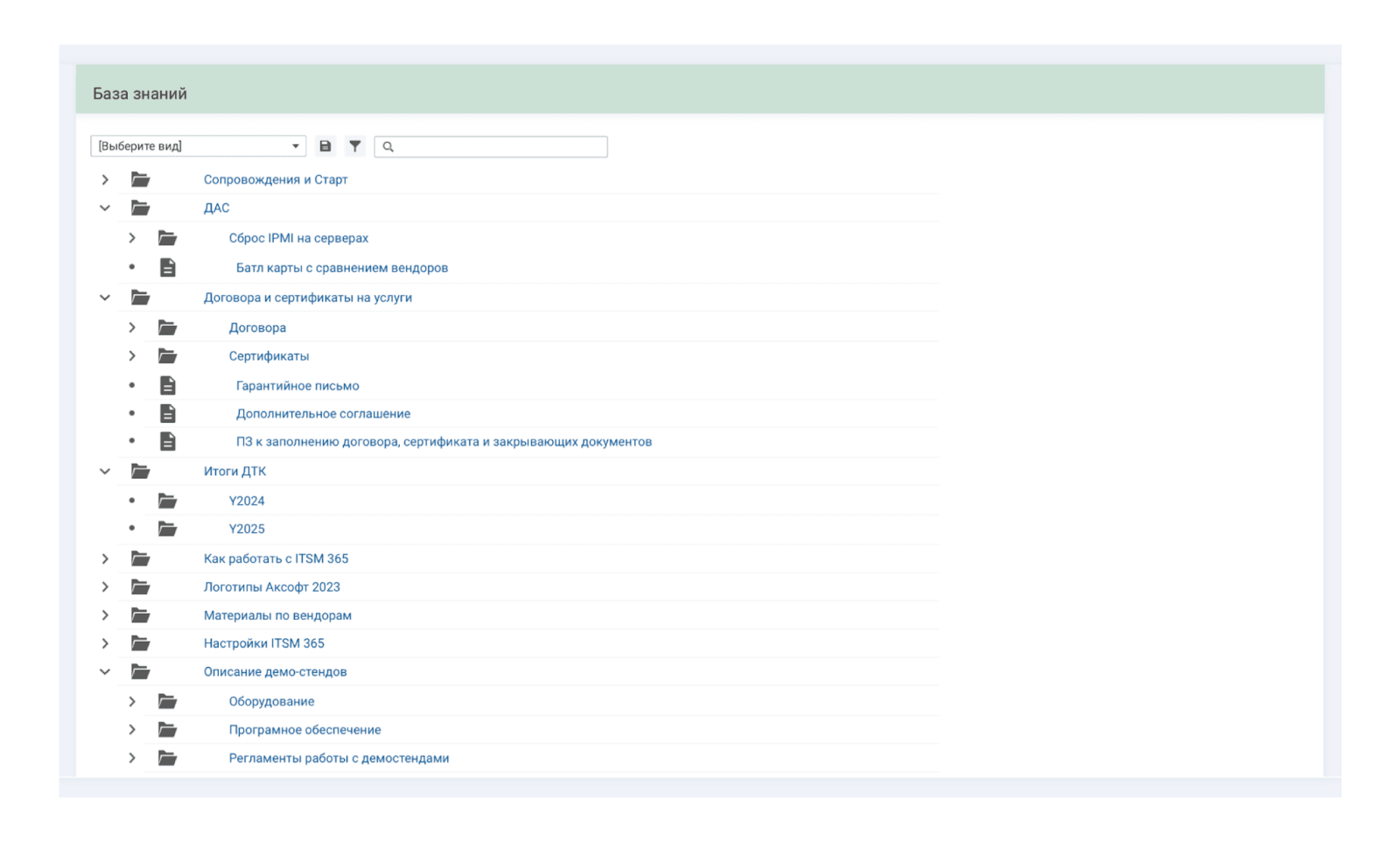 База знаний. В компании используют функциональность не в классическом виде. База знаний организована в разбивке по вендорам решений. Внутри разделов хранят разработанные для проектов шаблоны документов по разным продуктам, например, пояснительные записки, структурные схемы или инструкции по подготовке документации. Это позволяет быстрее выполнять типовые задачи.