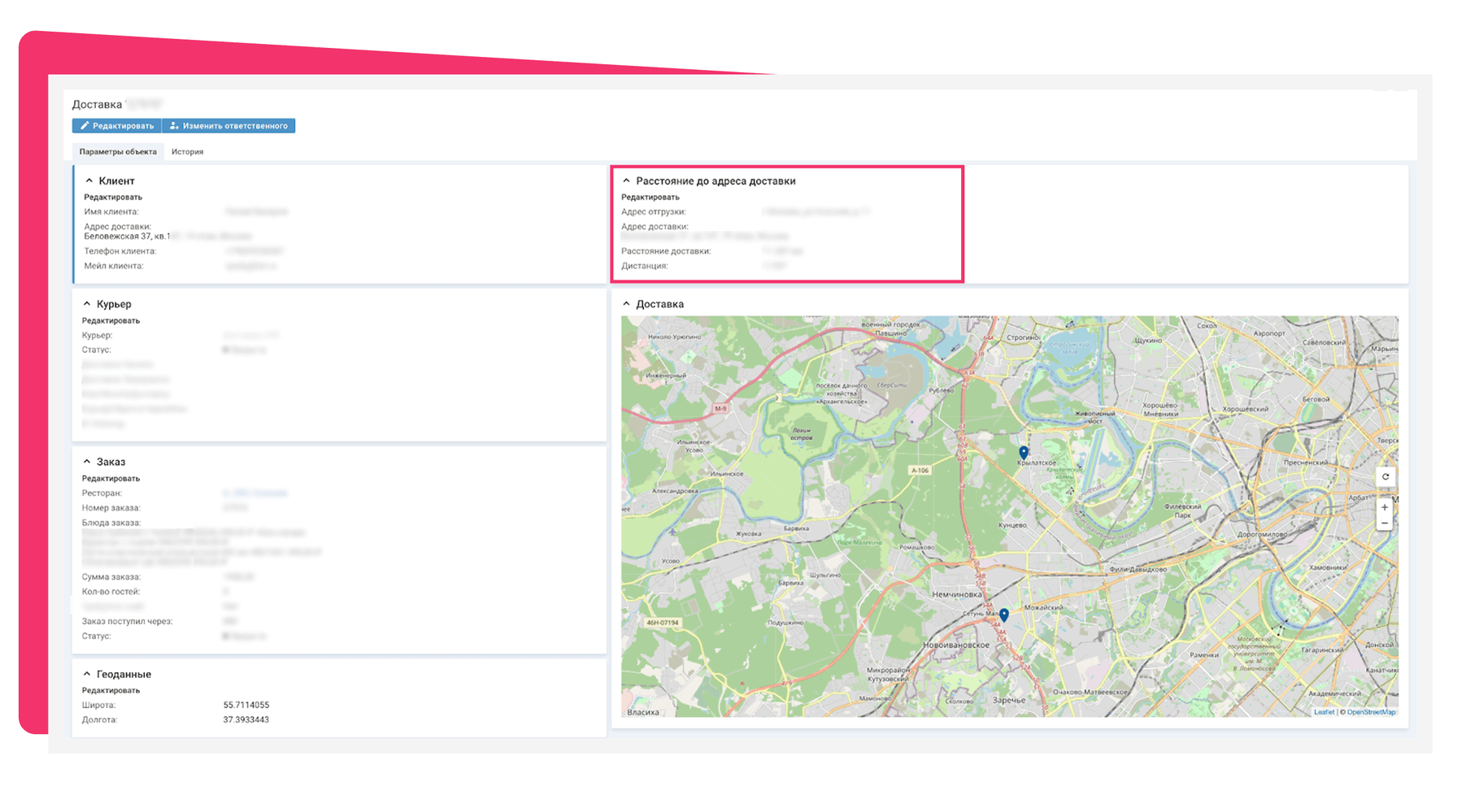 Например, сеть ресторанов использует интеграцию с DaData для управления доставкой. В системе отображаются координаты ресторана и адрес доставки, автоматически вычисляется расстояние между точками. В карточку доставки выводятся данные о клиенте, заказе и курьере. На карте в одной точке отображается адрес доставки, в другой — геолокация ресторана, из которого везут заказ. Потом заявку распределяют на ближайшего курьера.