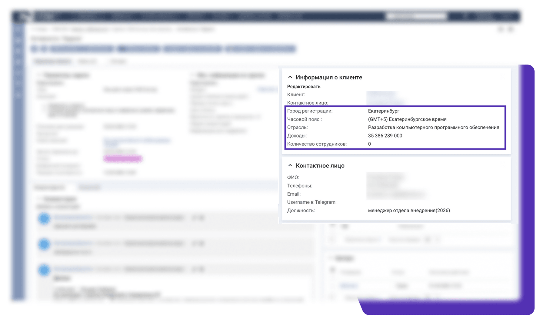 Информация может появляться в карточке при заведении нового клиента автоматически или по нажатию специально созданной кнопки — не нужно переключаться между системами и копировать информацию вручную.