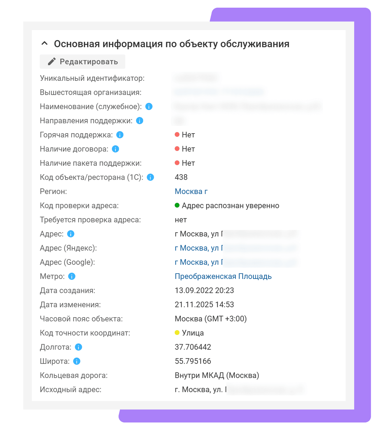 - Автоматическое определение координат. При создании или редактировании объекта обслуживания система сама заполняет атрибуты «Широта» и «Долгота» для указанного адреса. Это нужно, чтобы заявки от объектов обслуживания корректно отображались на карте.