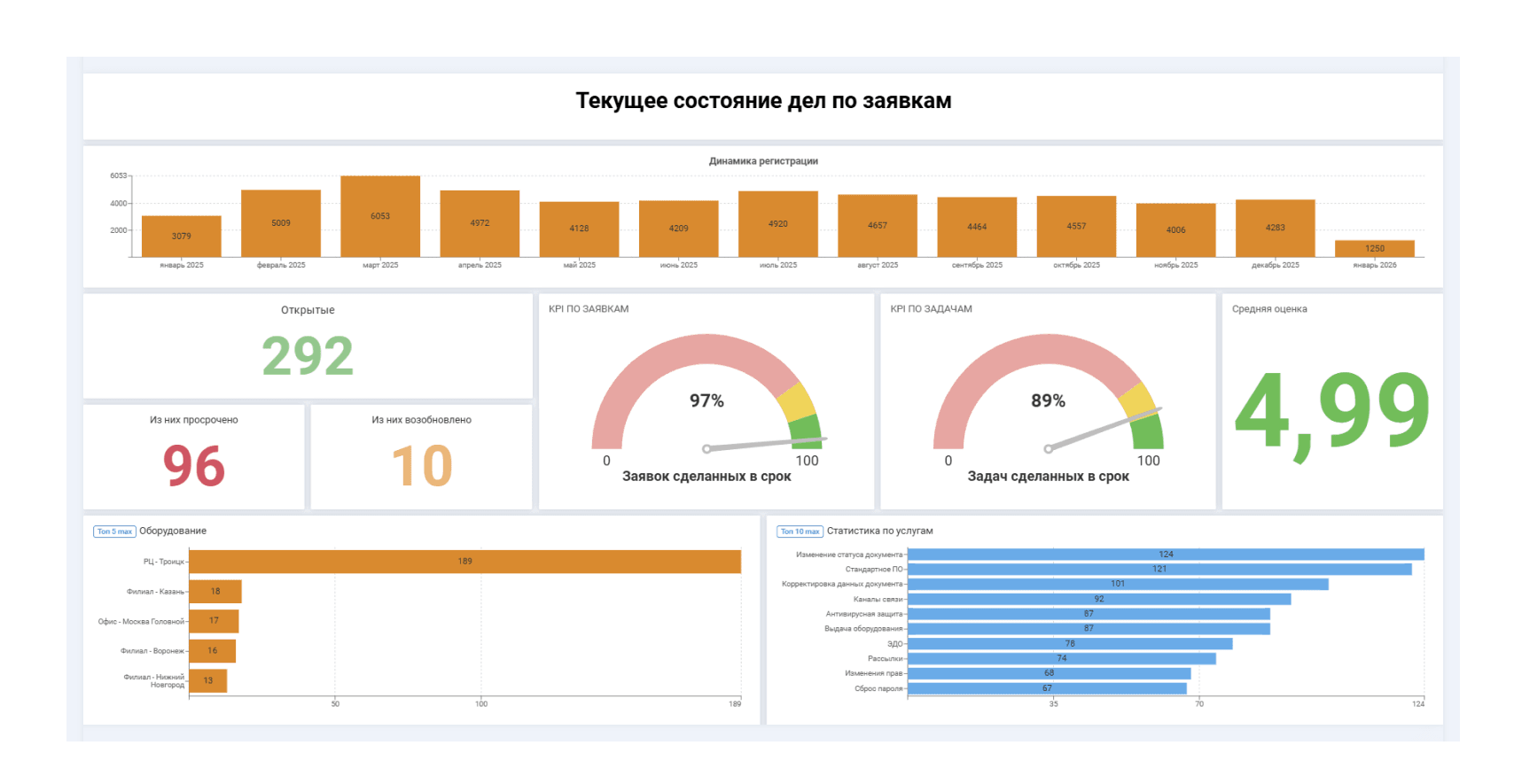 Дашборд для ИТ-директора. Для контроля работы подразделения руководитель настроил и ежедневно использует дашборд, в котором отслеживает такие метрики, как: