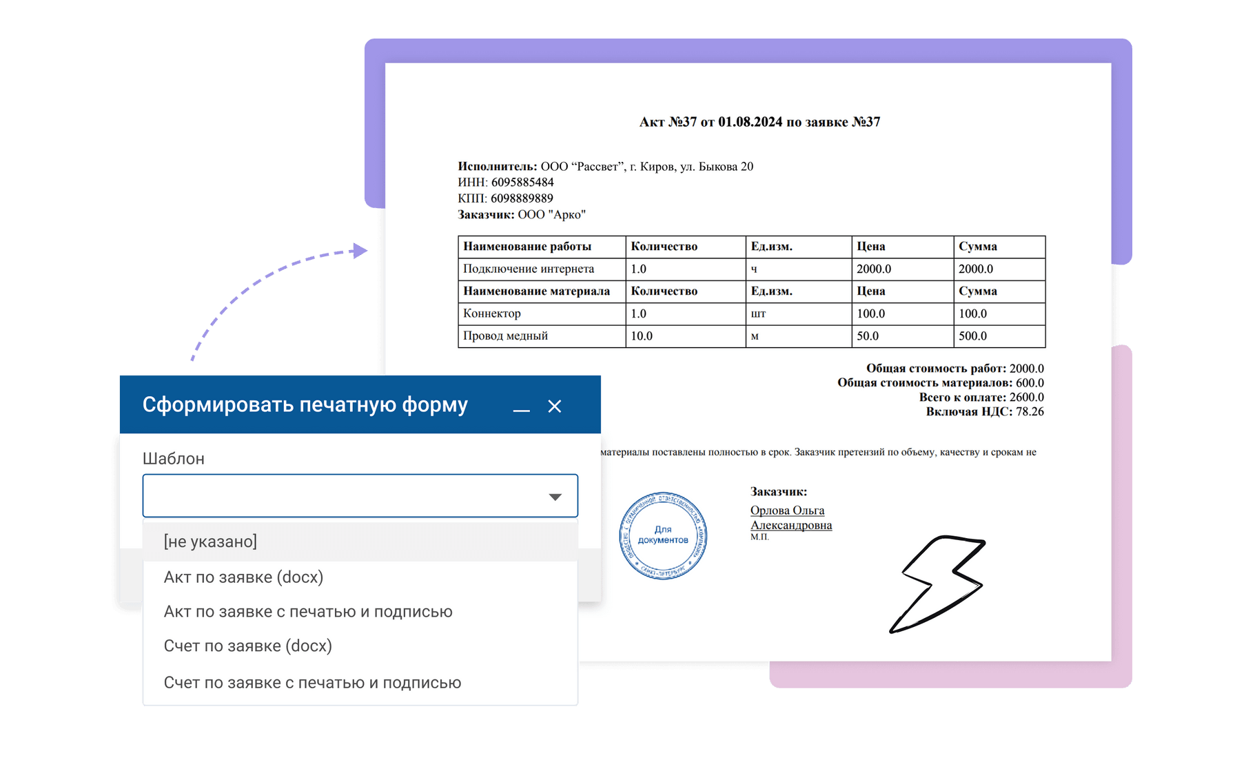 Прямо из карточки заявки специалист может сгенерировать счет или акт выполненных работ. Система использует готовые шаблоны, которые автоматически заполняются данными из спецификации и реквизитами обеих сторон.