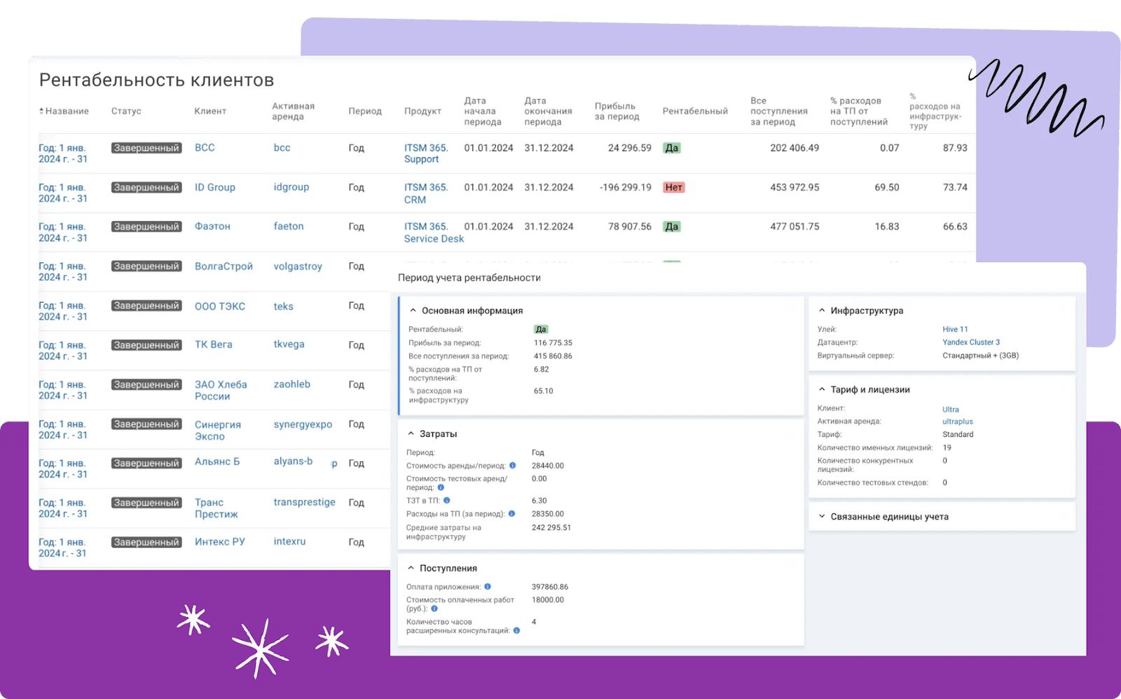 Так, провайдер облачных сервисов кастомизировал систему для детализации расходов по каждому клиенту: от затрат на техподдержку до аренды облака. В поступления вносят абонентский платеж, плату за консультации и настройку системы. На основании этих данных провайдер рассчитывает прибыль и принимает решение о дальнейшей работе с клиентами.