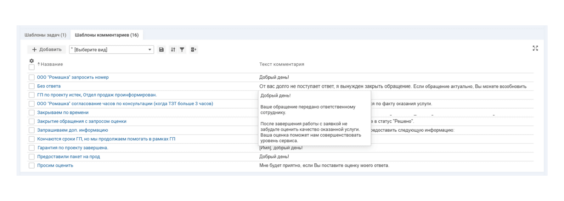 «Ваше обращение принято в работу», «Оцените нашу работу» — шаблонные комментарии создаются автоматически или добавляются инженером одним кликом после выбора из списка без дополнительных затрат времени.