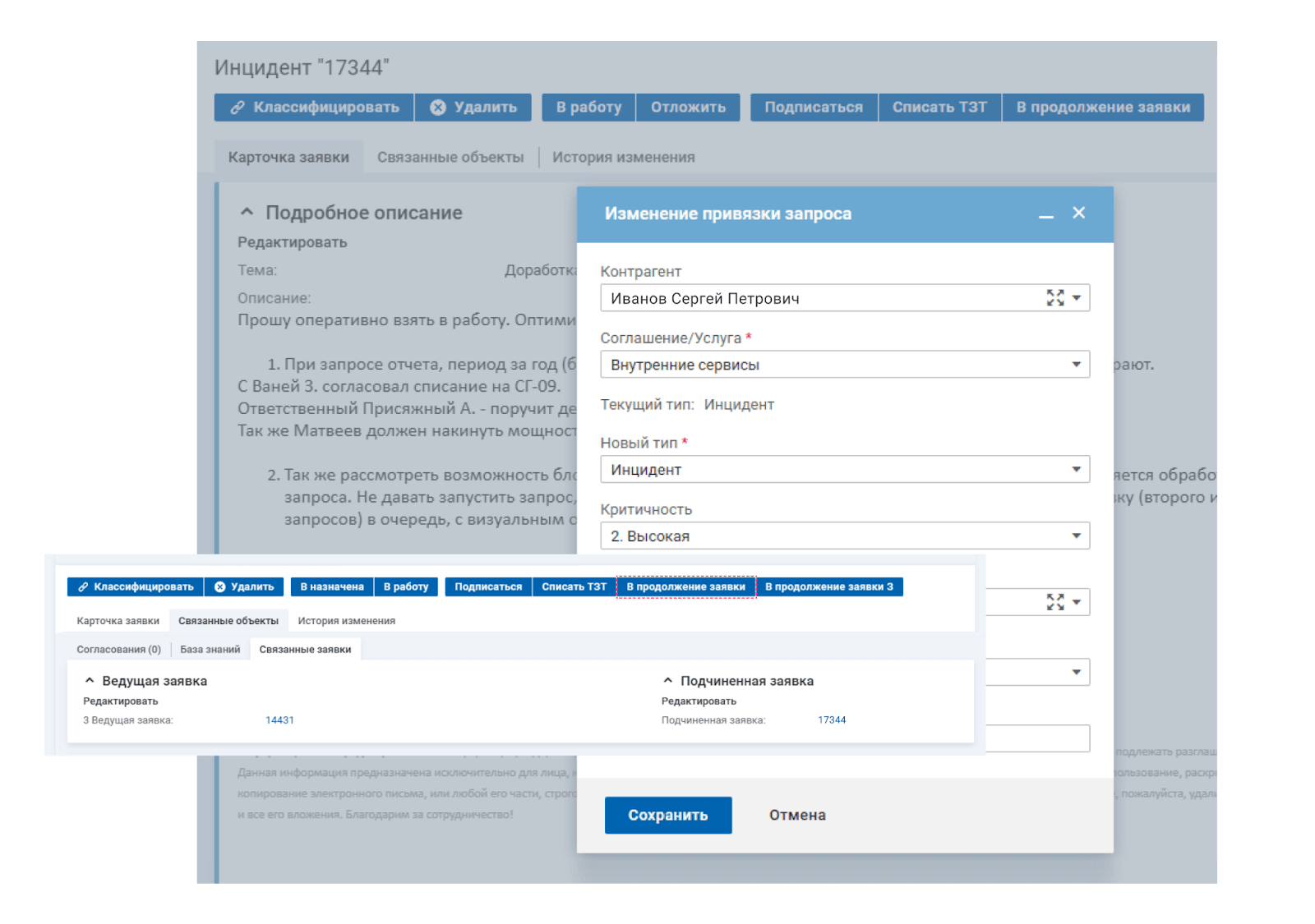 Классификация обращений и установление связей между заявками. С помощью кнопки «Классифицировать» в форме заявки дежурный специалист выбирает услугу, к которой относится обращение, и устанавливает его приоритет. Для установления связи с предыдущим закрытым обращением добавляет его номер во вкладке «В продолжение заявки». Связь с закрытой заявкой используется, как гарантия на модификацию. Например, гарантийный период задач на модификацию — 30 дней. Если клиент обратился в течение гарантийного срока — создают связь с этой заявкой.