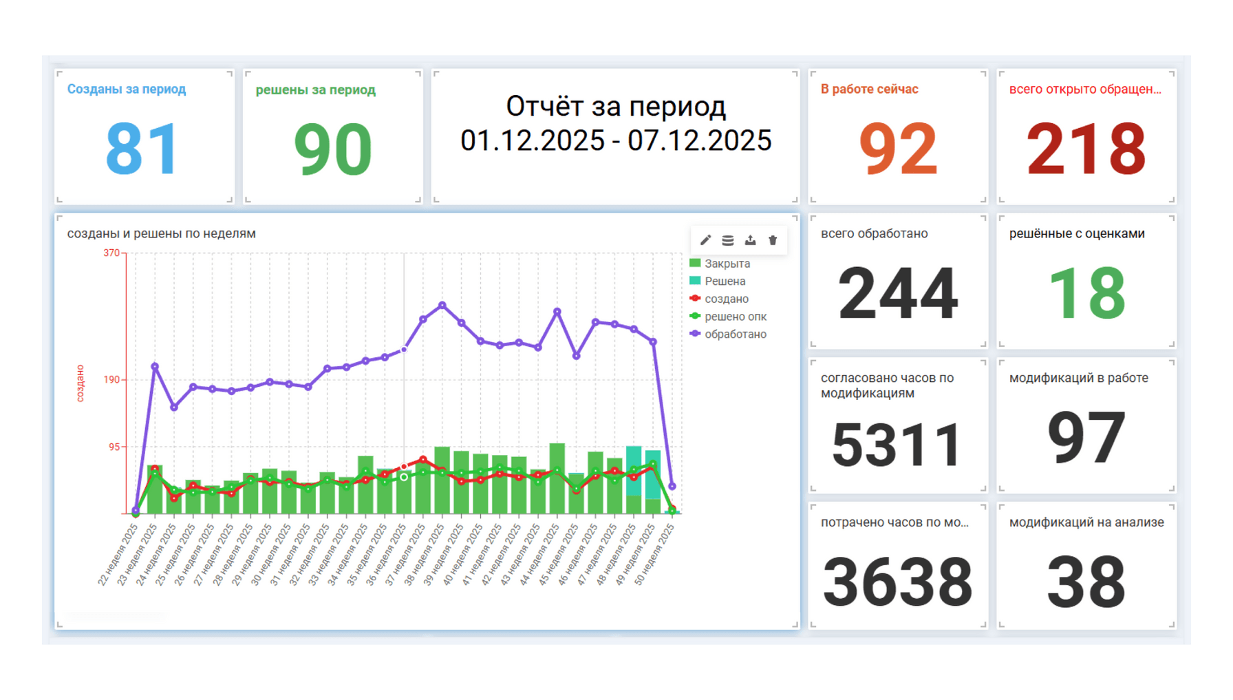 - Сколько обращений открыто, в работе и решено с оценками.