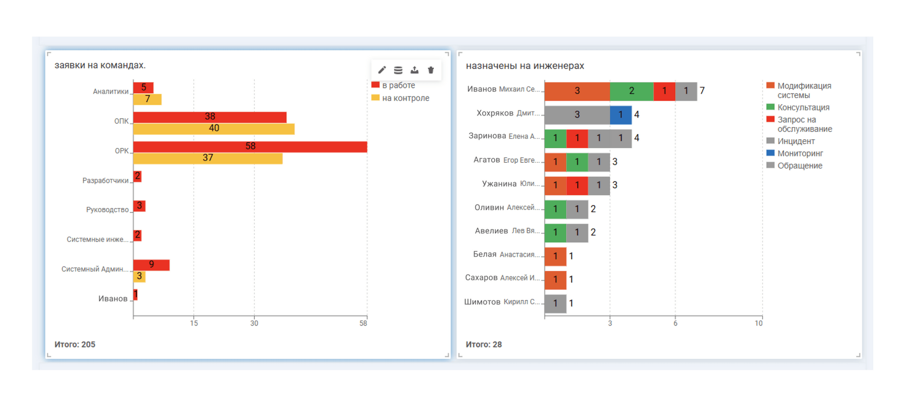 - Какая загрузка у команд и сотрудников. На кого назначены обращения и в каком они статусе.