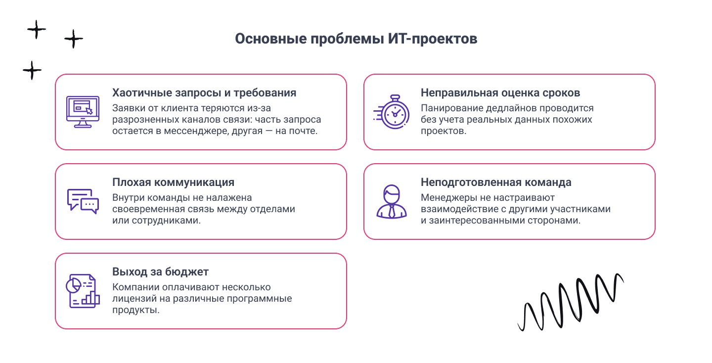 Рассмотрим основные проблемы, с которыми сталкиваются ИТ-команды, и как внедрение системы для управления проектами помогает их решить.