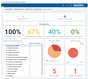 Дашборд содержит статистику по работе над вакансиями и доступен для участников команд с правами "Участники процесса подбора".