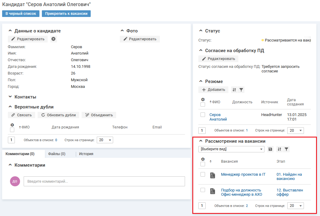- "Другие рассмотрения кандидата" — содержит список рассмотрений кандидата на другие вакансии.