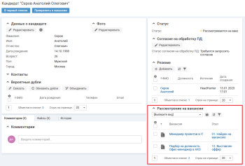 Чтобы посмотреть список рассмотрений кандидата на разные вакансии, в карточке кандидата разверните блок "Рассмотрение на вакансии".