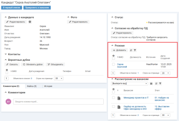 - "Рассмотрения на вакансии" — содержит список рассмотрений кандидата по вакансиям и этапы рассмотрения. Новые рассмотрения добавляются по мере прикрепления этого кандидата к новым вакансиям.