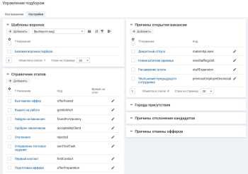 Чтобы посмотреть список этапов, в левом меню выберите "Процессы" → "Управление подбором" → вкладка "Настройки" → блок "Справочник этапов".