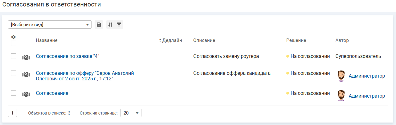 На панели управления списком для выбора доступны следующие виды списка согласований: