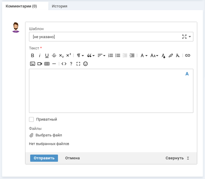 "Шаблон" — выберите один из доступных шаблонов комментариев. После выбора шаблона поле "Текст" будет заполнено значением из шаблона. Поле отображается, если в системе созданы шаблоны комментария.
