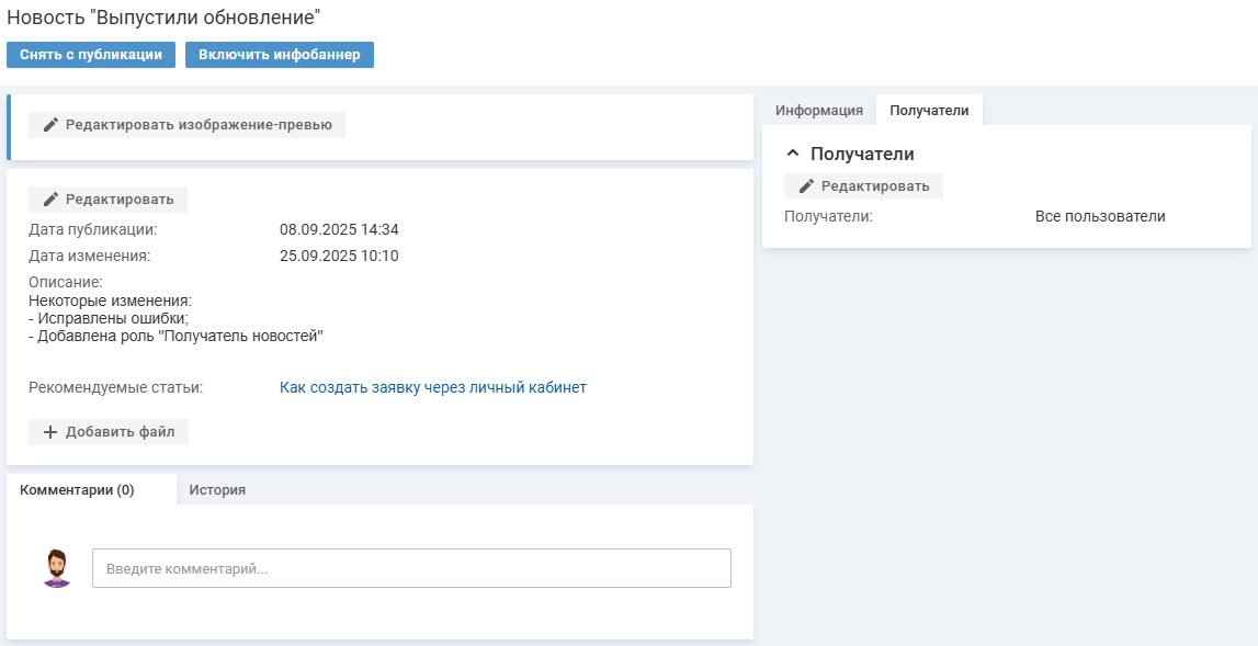 Чтобы включить или отключить инфобаннер, в карточке новости нажмите соответствующую кнопку "Включить инфобаннер" или "Выключить инфобаннер".