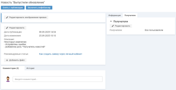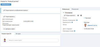 - вкладка "Комментарии" — отображаются комментарии, добавленные к новости. Рядом с названием вкладки отображается общее количество комментариев.