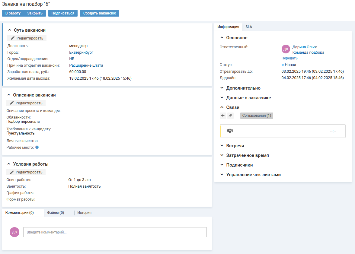 Рекрутер может создавать задачи, если требуется, для подготовки к работе над вакансией, вести переписку с заказчиком по вопросам и добавлять файлы в карточку заявки.