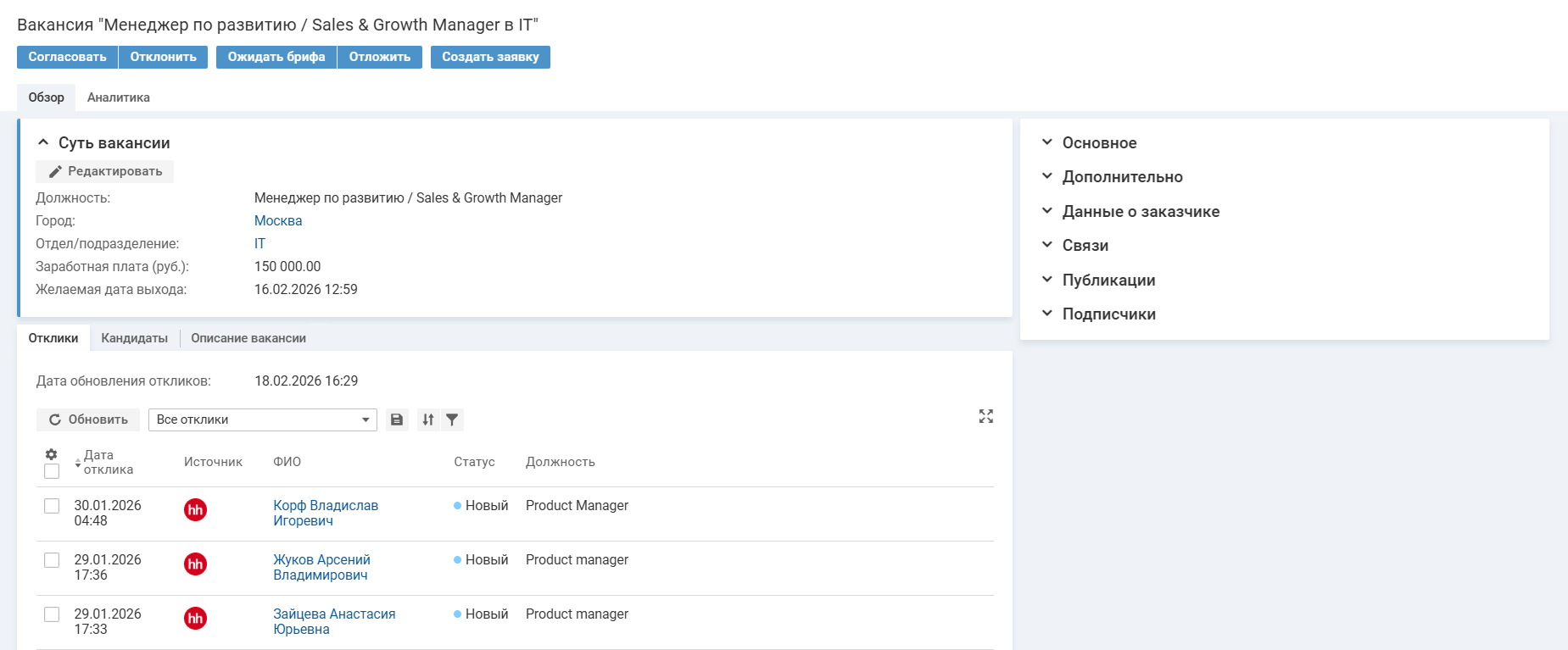 Список откликов в карточке вакансии может обновляться автоматически по мере появления откликов на работном сайте. Если статус отклика на работном сайте изменяется, информация обновляется в системе, при условии, что отклик еще не был рассмотрен. Автоматическое обновление настраивает администратор, подробнее.