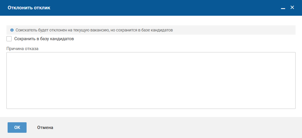 - "Причина отказа" — причина отклонения, которая будет отправлена кандидату.