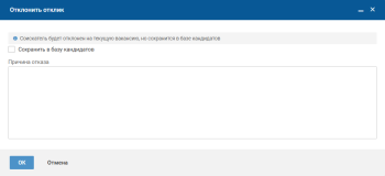 Если кандидат не подходит на вакансию, в карточке отклика нажмите кнопку Отклонить, заполните поля на форме и нажмите кнопку ОК. Статус отклика изменяется на "Отклонен".