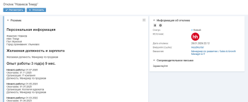 После этого в системе автоматически создается рассмотрение кандидата на текущую вакансию, и дальнейшая работа ведется уже в рамках этого рассмотрения, подробнее. В базу кандидатов сохраняются кандидат и резюме.
