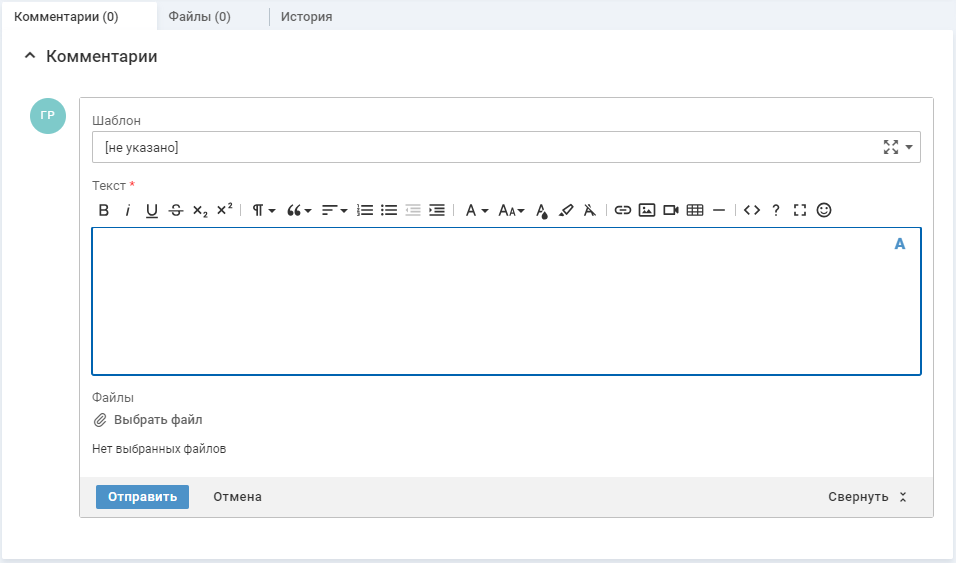 "Шаблон" — выберите один из доступных шаблонов комментариев. После выбора шаблона поле "Текст" будет заполнено значением из шаблона,