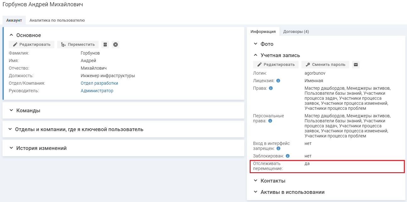 Для активации передачи геопозиции пользователя, в интерфейсе оператора включите параметр "Отслеживать перемещение" в карточке пользователя на вкладке "Аккаунт" → "Информация" в блоке "Учетная запись", подробнее.