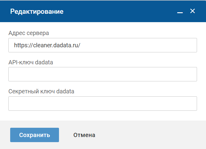 - API-ключ: укажите ключ, полученный в личном кабинете dadata.ru