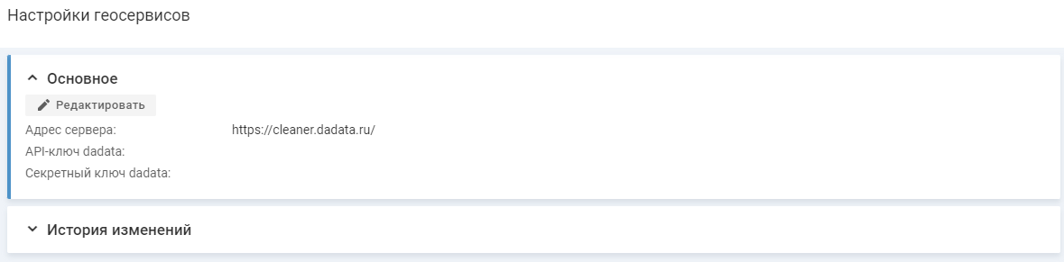 Настройте параметры подключения по API в интерфейсе оператора. В левом меню разверните пункт "Настройки" → Настройки геосервисов" и в блоке "Основное" нажмите кнопку "Редактировать".