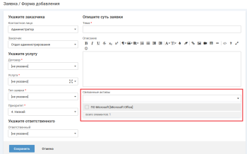 Если в заявке указан заказчик (отдел, компания или объект обслуживания) и не указано контактное лицо, то для выбора доступны активы, находящиеся в пользовании отдела / компании / объекта обслуживания.