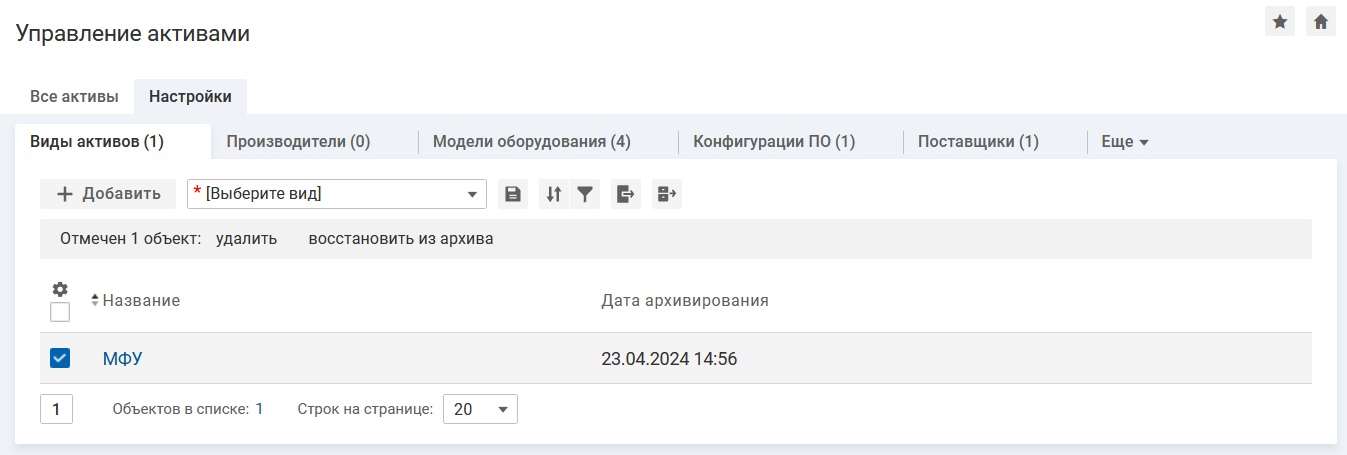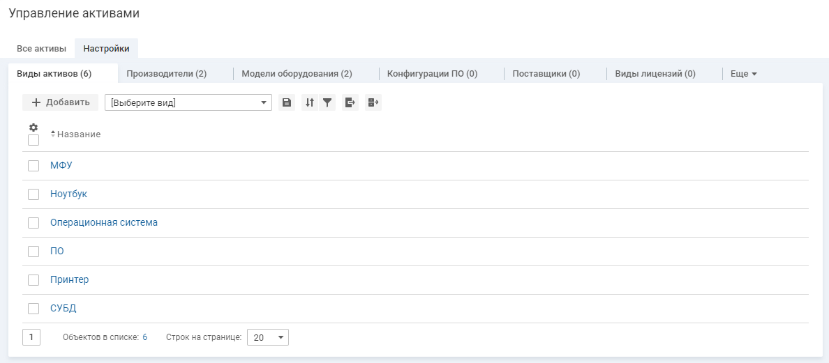 Чтобы просмотреть список видов активов, в левом меню выберите пункт "Процессы" → "Управление активами"→ "Настройки" и перейдите на вкладку "Виды активов".