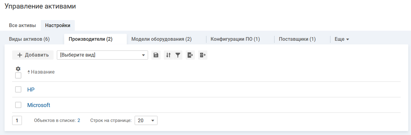 Чтобы просмотреть список производителей, в левом меню выберите пункт "Процессы" → "Управление активами"→ "Настройки" и перейдите на вкладку "Производители".