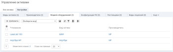 Чтобы просмотреть список моделей оборудования, в левом меню выберите пункт "Процессы" → "Управление активами"→ "Настройки" и перейдите на вкладку "Модели оборудования".