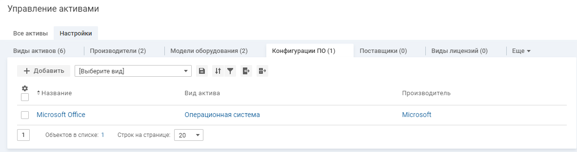 - "Вид актива" — ссылка на вид актива, связанный с конфигурацией ПО;
