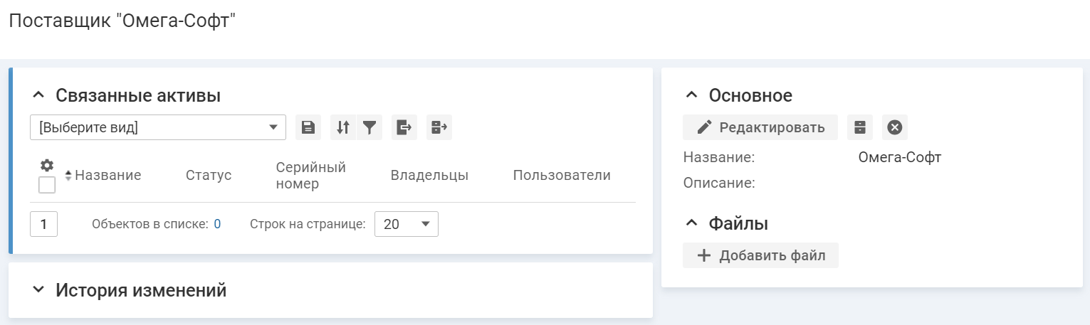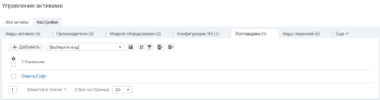 Чтобы просмотреть список поставщиков, в левом меню выберите пункт "Процессы" → "Управление активами"→ "Настройки" и перейдите на вкладку "Поставщики".