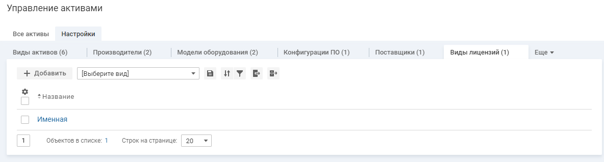 Чтобы просмотреть список видов лицензий, в левом меню выберите пункт "Процессы" → "Управление активами"→ "Настройки" и перейдите на вкладку "Виды лицензий".