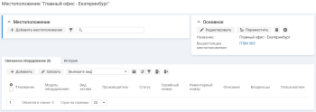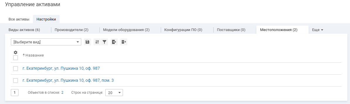 Чтобы просмотреть список местоположений, в левом меню выберите пункт "Процессы" → "Управление активами" → "Настройки" и перейдите на вкладку "Местоположения".