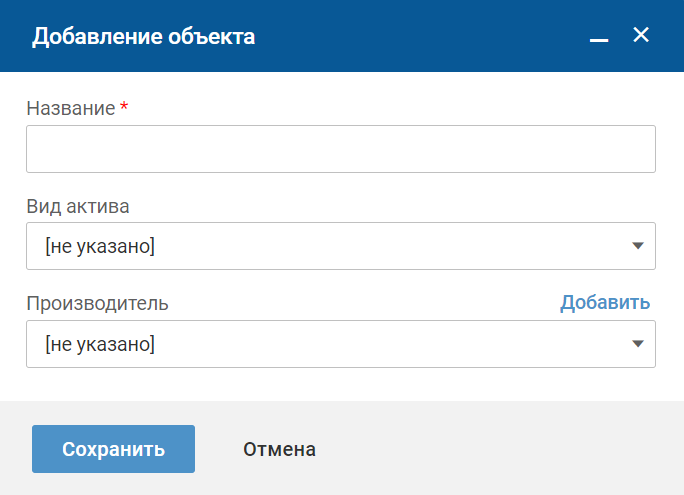 На форме добавления объекта заполните поля "Название", "Вид актива", "Производитель" и нажмите кнопку "Сохранить".