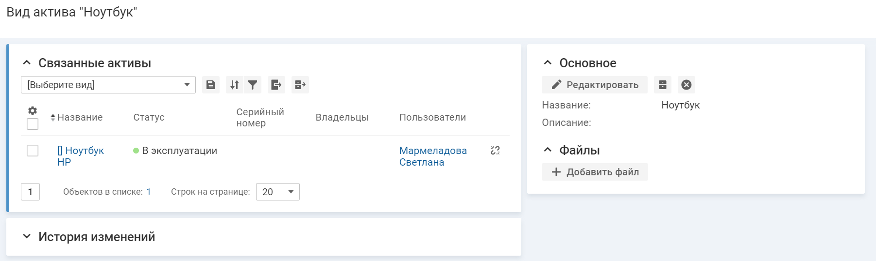 Чтобы перейти в карточку вида актива, нажмите на название вида актива в списке.