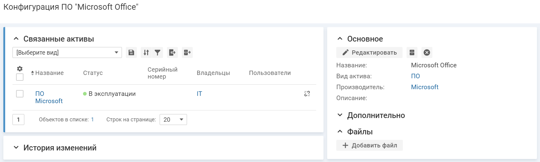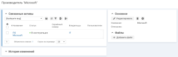 - блок "Связанные активы" — отображаются активы, связанные с данной конфигурацией ПО;