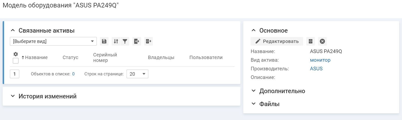 - блок "Связанные активы" — отображаются активы, связанные с данной моделью;