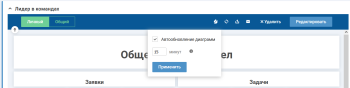 При включенном автообновлении данные на дашборде будут обновляться через определенный интервал времени, настроенный пользователем. По умолчанию автоматическое обновления дашборда отключено, подробнее.
