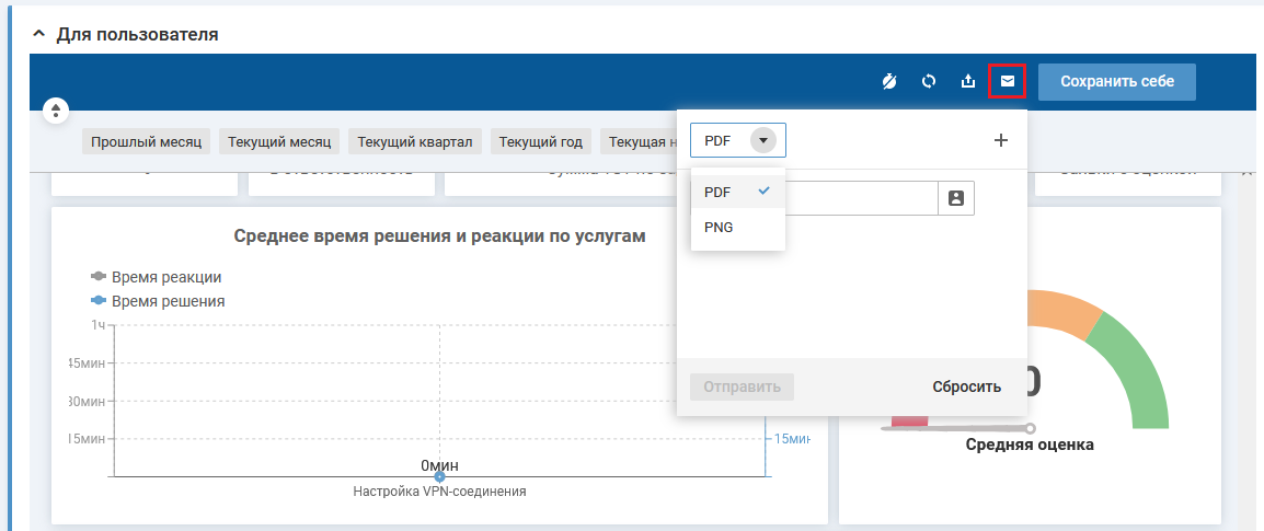 Чтобы отправить дашборд на почту, нажмите иконку "Отправить на почту" на панели управления дашбордом и выберите нужный формат, затем выберите получателя письма.