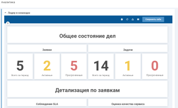 Раздел "Общее состояние дел" содержит общие метрики по заявкам и задачам: